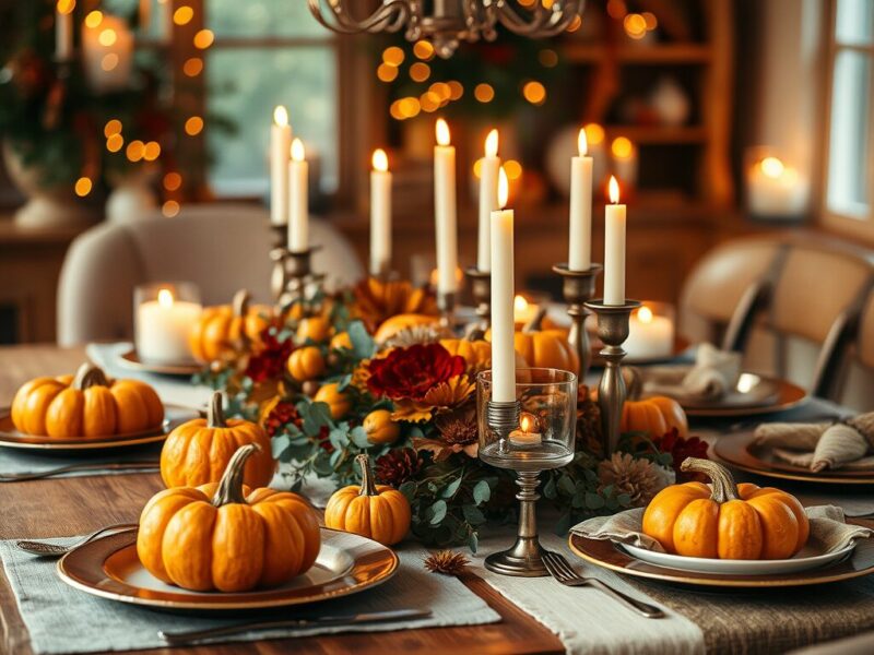 A floral arrangement, pumpkin stack, or layered candle display can be the focal point of your table. Keep the height balanced so guests can still chat across the table.