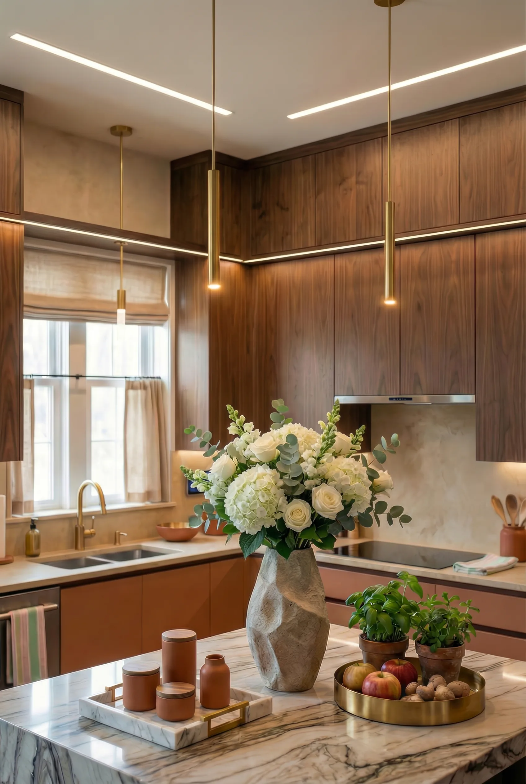 Mix modern and rustic: Blend sleek kitchen styles with cozy fresh textures.
