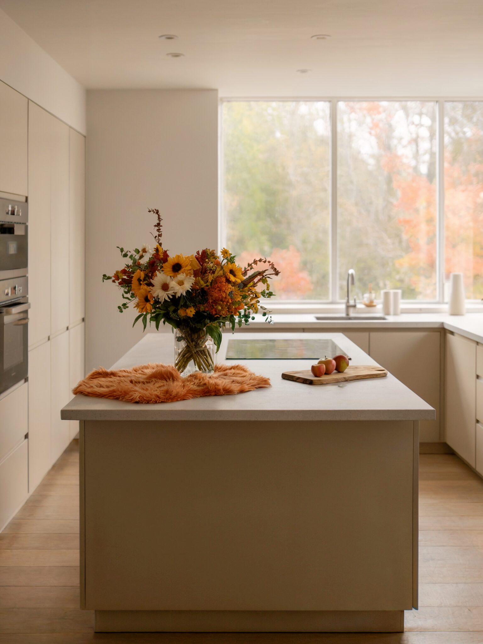 Dress your kitchen island with seasonal trays, beautiful textured florals, and ceramic bowls filled with apples or gourds.